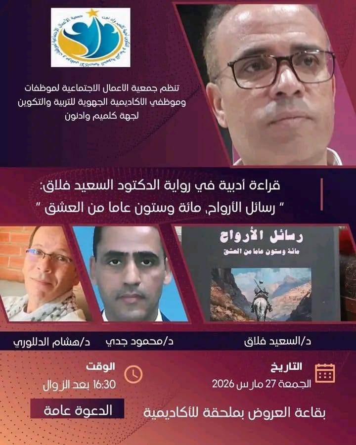 في خطوة تعكس التحول النوعي الذي يشهده الاهتمام بالأنشطة الثقافية داخل الأوساط المهنية، تحتضن جهة كلميم وادنون موعداً أدبياً مميزاً، يجمع بين الكلمة الراقية والفكر العميق، من خلال تنظيم قراءة أدبية في رواية « رسائل الأرواح: مائة وستون عاماً من العشق » للدكتور الطبيب والأديب المتألق سعيد الفلاق.
