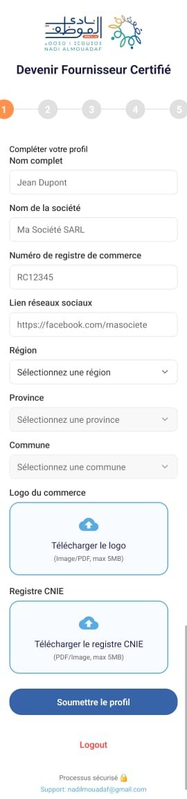 المستخدم كيعمر المعلومات ديال الشركة (اسم، RC، روابط)، يحدد الجهة والإقليم، ويرفع الوثائق (شعار الشركة + نسخة من السجل التجاري). من بعد يضغط على Soumettre le profil باش يمشي للخطوة الثانية.