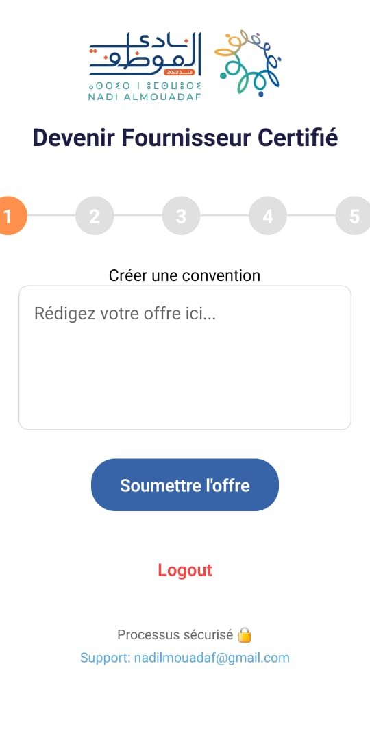 المستخدم كيبدا عملية التسجيل كمزوّد خدمة بإنشاء عرض رسمي أو صياغة اتفاقية أولية (مثلاً وصف الخدمات أو التخفيضات اللي غادي يقدمها). من بعد ما يكتب العرض، كيكبس على Soumettre l’offre باش يرسلها للإدارة.