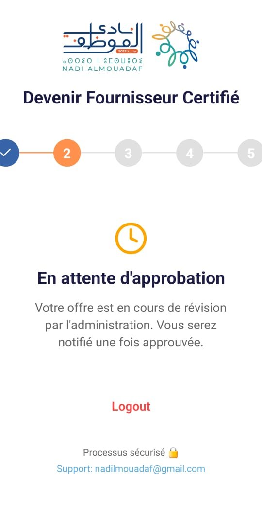 بعد ما كيكمّل المزود تسجيلو (معلومات الشركة + العرض)، كيتسجّل العرض عند الإدارة.