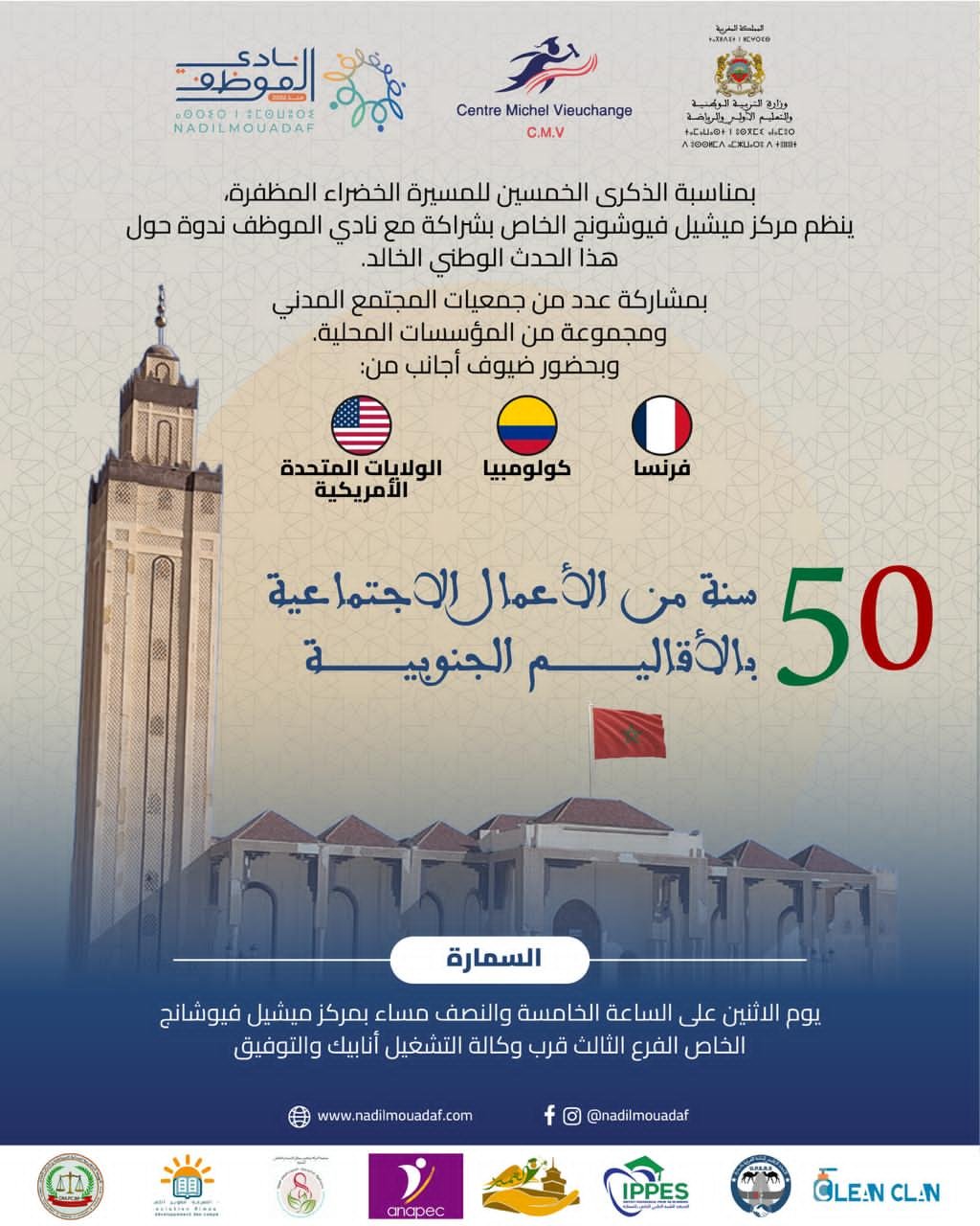 تحت شعار: « 50 سنة من الأعمال الاجتماعية بالأقاليم الجنوبية »، تنطلق غداً الاثنين 3 نونبر 2025 بمدينة السمارة أولى محطات القافلة الاجتماعية التي يشرف عليها نادي الموظف بشراكة مع مركز ميشيل فيوشانغ الخاص، تخليداً للذكرى الخمسين للمسيرة الخضراء المظفّرة، وفي سياق ترسيخ المكتسبات الوطنية بعد تبني مجلس الأمن مقترح الحكم الذاتي كحلّ واقعي وجاد للنزاع المفتعل حول الصحراء المغربية.