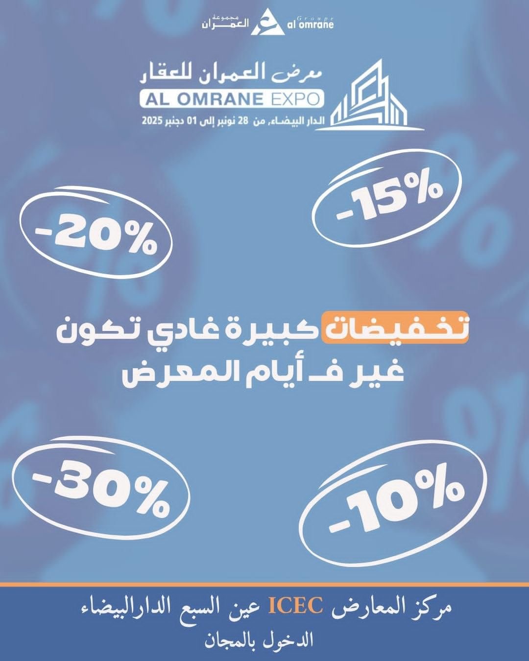 ينطلق يوم الجمعة 28 نونبر معرض العمران للعقار في دورته التاسعة، الذي يُعد أحد أكبر التظاهرات العقارية بالمغرب، مقدّمًا للزوار أفضل العروض الخاصة بالسكن والاستثمار. ويستمر المعرض إلى غاية 1 دجنبر بمركز المعارض ICEC بشارع ماكرو بمنطقة عين السبع بالدار البيضاء، مع دخول مجاني طيلة أيام الفعالية.